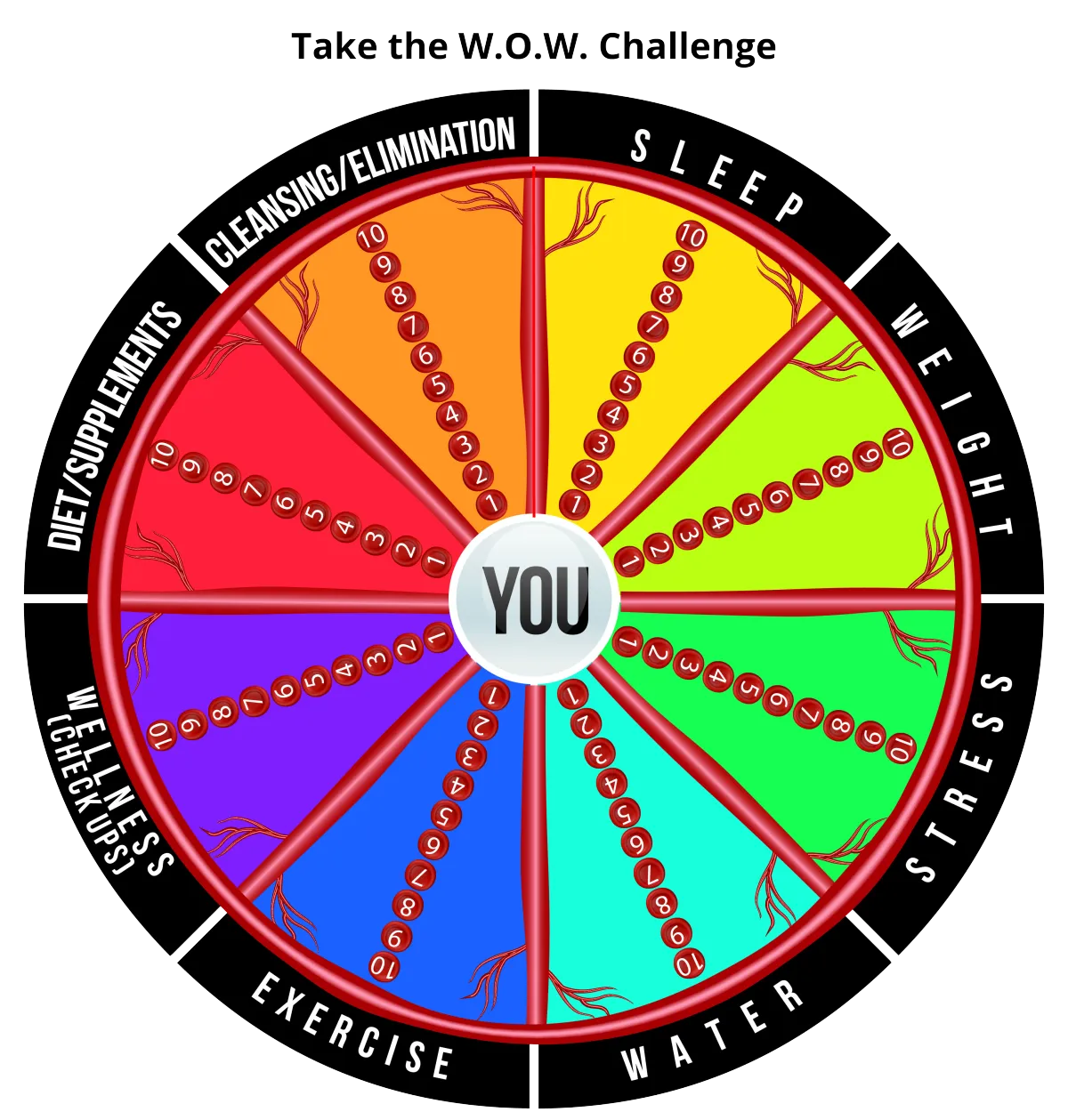 Discover the power of self-assessment with our Wheel of Wellness tool. This innovative graphic helps you evaluate and enhance your overall health by focusing on eight key areas: Sleep, Weight Management, Stress, Water, Exercise, Wellness Checkups, Whole Food Diet/Supplements, and Cleansing/